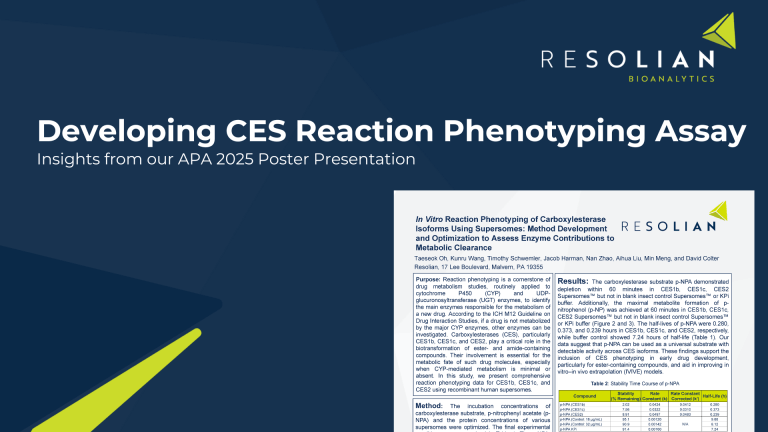 Our work, presented at APA 2025, focuses on developing an in vitro CES reaction phenotyping using p-nitrophenyl acetate (p-NPA) as a universal substrate. In this study, we compared different CES substrates, optimized the experimental conditions and developed an LC-MS method for simultaneous detection of p-NPA and its metabolites.