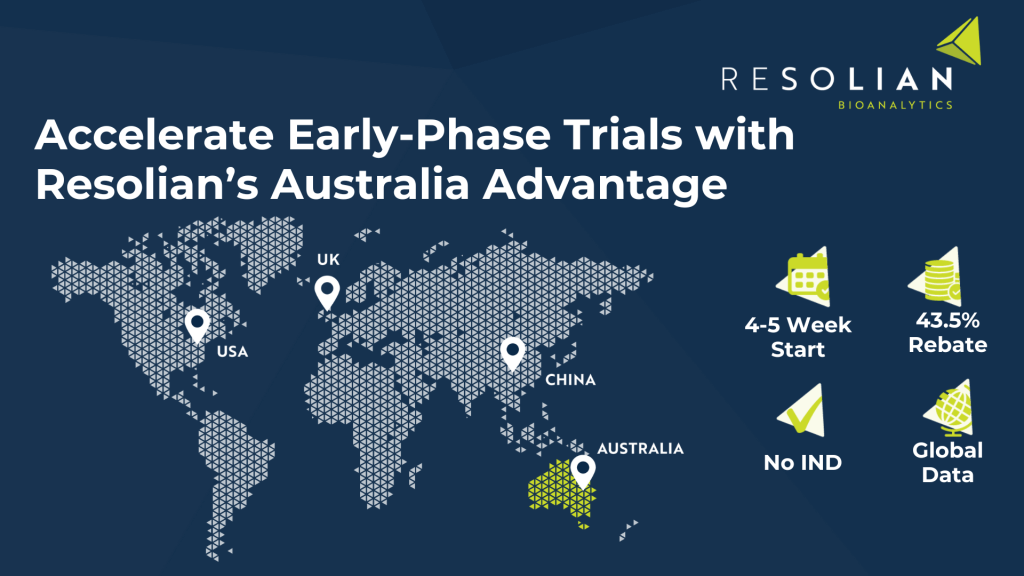 Resolian is a global bioanalytical partner offering seamless assay transfer to the US, UK, or China, ensuring continued support beyond Phase 1 clinical trials in Australia for a cost-effective and efficient drug development process.